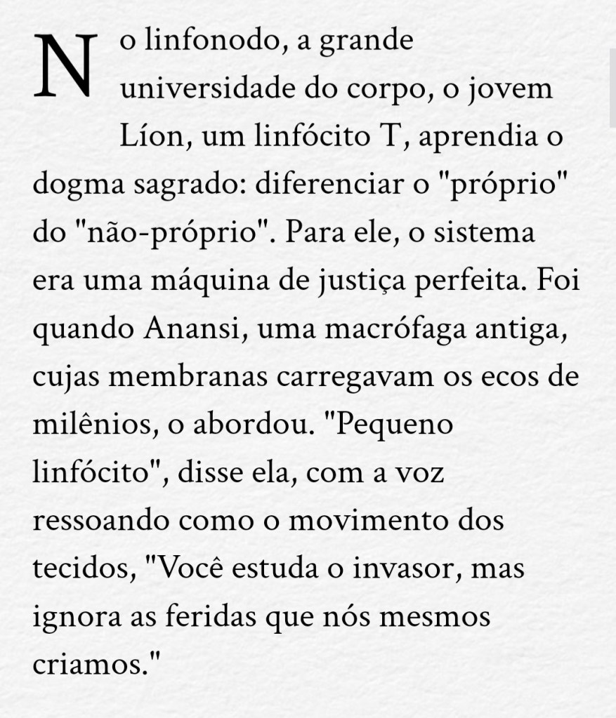 - A imunologia é apresentada como uma “tragédia em muitos atos”. O que o autor quer dizer com essa metáfora? Use exemplos da história, como o câncer de Messer Valeriano ou o HIV de Marcos, para ilustrar como o corpo pode trair a si mesmo ou ser vítima de sua própria complexidade.