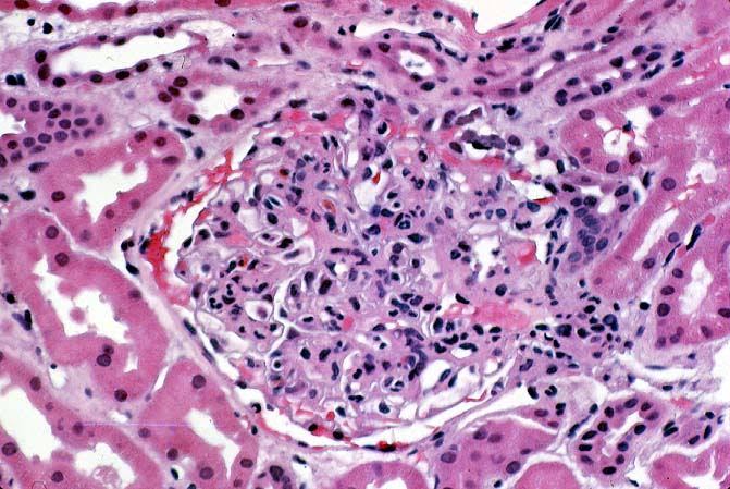 A biópsia renal mostra infiltrado inflamatório difuso no interstício renal e glomérulos com alterações variáveis, incluindo proliferação celular. Esta é uma manifestação comum e grave do Lúpus Eritematoso Sistêmico (LES) conhecida como nefrite lúpica. O mecanismo imune envolve a deposição de complexos imunes (contendo autoanticorpos e autoantígenos) nos glomérulos e túbulos renais, levando à ativação do sistema complemento e ao recrutamento de células inflamatórias (linfócitos, macrófagos) que causam dano tecidual e disfunção renal.