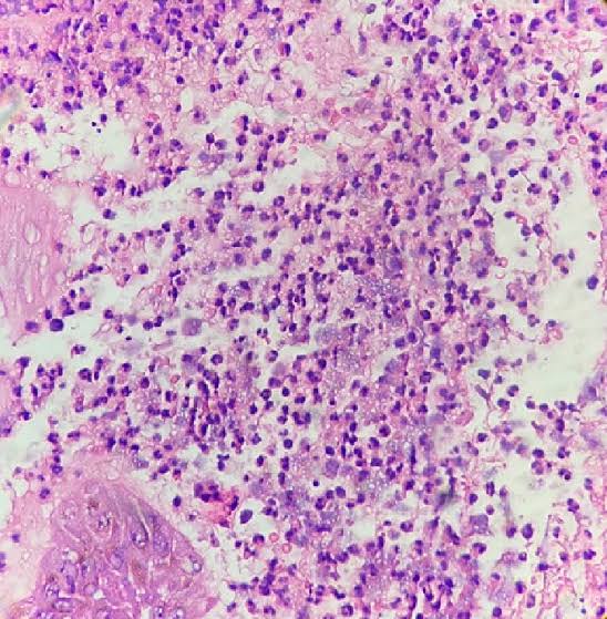 A imagem mostra um infiltrado inflamatório denso composto por neutrófilos, característico de um abscesso ou uma inflamação aguda severa. Os neutrófilos são as primeiras células imunes a serem recrutadas para o local de uma infecção bacteriana ou lesão tecidual. Eles fagocitam patógenos e detritos celulares e liberam enzimas e mediadores inflamatórios. Essa resposta imune inata é crucial para combater infecções, mas a liberação excessiva de mediadores pode também contribuir para o dano tecidual.