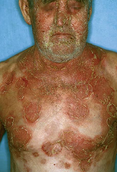 A imagem exibe um quadro cutâneo grave com extensas áreas de erosões e crostas, consequência do rompimento de bolhas. Esta é uma manifestação característica do Pênfigo Vulgar, uma doença autoimune bolhosa grave que afeta a pele e as mucosas. O Pênfigo Vulgar é um exemplo clássico de uma reação de hipersensibilidade do tipo II. O sistema imune produz autoanticorpos, especificamente da classe IgG, contra proteínas estruturais da própria pele. Os alvos desses anticorpos são as desmogleínas (principalmente a desmogleína 3 e/ou 1), que são componentes essenciais dos desmossomos — as estruturas que funcionam como “cola” para manter as células da epiderme (queratinócitos) unidas. A ligação dos anticorpos às desmogleínas interfere na sua função adesiva, causando a separação dos queratinócitos uns dos outros. Esse processo é chamado de acantólise. A perda de coesão celular leva à formação de bolhas flácidas dentro da epiderme. Como essas bolhas são superficiais e frágeis, elas se rompem facilmente, resultando nas dolorosas erosões e lesões abertas vistas na imagem.