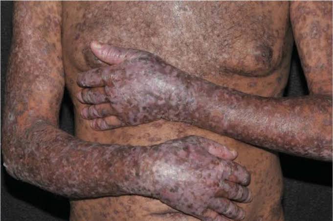 A imagem ilustra uma manifestação cutânea grave da Doença do Enxerto contra o Hospedeiro (DECH), com um exantema (rash) maculopapular e violáceo generalizado. Esta é uma complicação séria e potencialmente fatal que pode ocorrer após um transplante de células-tronco hematopoiéticas (transplante de medula óssea) ou, mais raramente, de órgãos sólidos. Ao contrário da rejeição de transplante tradicional (onde o hospedeiro ataca o enxerto), na DECH, as células imunes do doador (o enxerto) atacam os tecidos do receptor (o hospedeiro). Linfócitos T imunocompetentes presentes no enxerto doado reconhecem as células e tecidos do hospedeiro como estranhos, devido a diferenças nos antígenos de histocompatibilidade (HLA). O mecanismo central é uma reação de hipersensibilidade do tipo IV (mediada por células). Os linfócitos T do doador se ativam, proliferam e montam um ataque direto contra as células do hospedeiro. Os principais alvos são a pele, o trato gastrointestinal e o fígado. Na pele, o ataque dos linfócitos T do doador contra os queratinócitos do hospedeiro desencadeia uma cascata inflamatória intensa, resultando no rash severo, que pode progredir para bolhas e descamação, como visto na imagem.