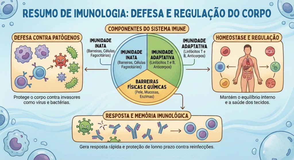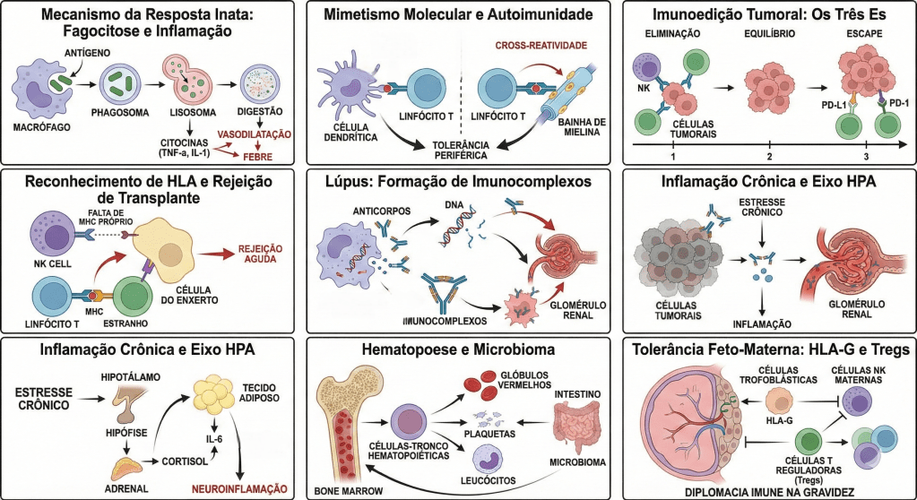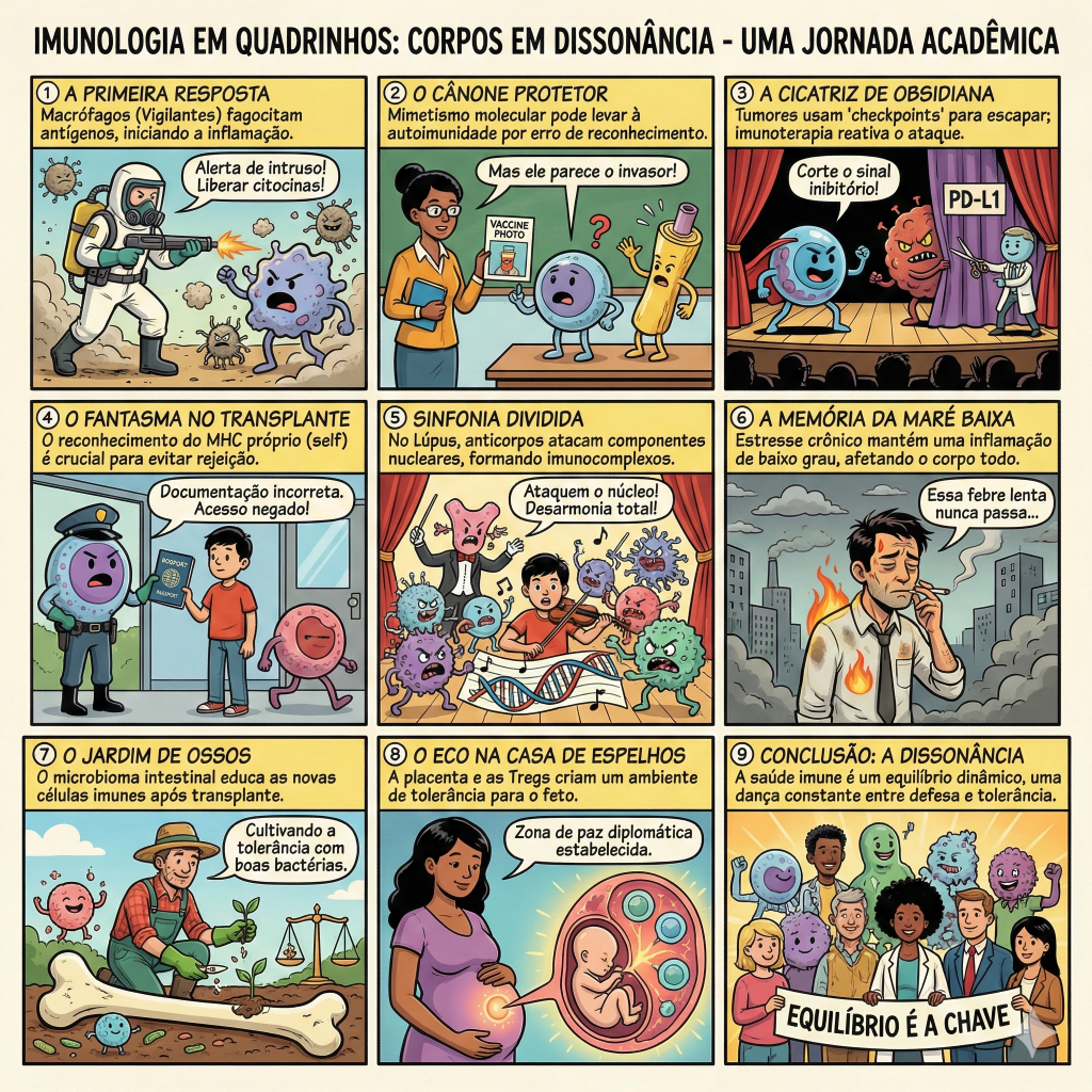 O grande trunfo desse processo adaptativo é a geração de memória imunológica. Após a resolução do desafio, uma população de linfócitos de vida longa permanece no organismo, pronta para responder de forma muito mais rápida e vigorosa em um reencontro futuro. É nesse princípio que se baseiam as vacinas: elas são um ensaio seguro, uma forma de educar o sistema apresentando-lhe o “retrato” do agente sem o risco da doença, permitindo que o corpo desenvolva competência defensiva antecipadamente.