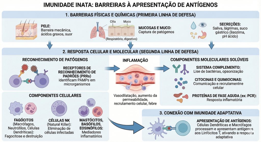 Essas sentinelas compõem a linha de frente da imunidade inata, nossa resposta mais antiga e rápida. Ao detectar padrões moleculares típicos de microrganismos ou de células danificadas, esses componentes iniciam uma resposta inflamatória controlada para conter a situação e iniciar o reparo. Recentemente, descobrimos que essa imunidade inata possui uma forma de memória funcional, chamada de imunidade inata treinada. Através de modificações epigenéticas, células como os monócitos podem se tornar mais eficientes em responder a desafios subsequentes após um primeiro estímulo, mostrando que a capacidade de aprendizado do sistema é mais ampla do que imaginávamos.