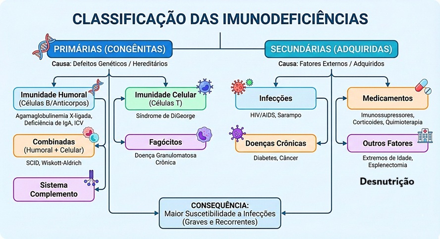 Por outro lado, quando o sistema falha por insuficiência de componentes ou função, temos as imunodeficiências, que podem ser primárias, de origem genética, ou secundárias, adquiridas por fatores como desnutrição, infecções virais ou uso de certos fármacos.
