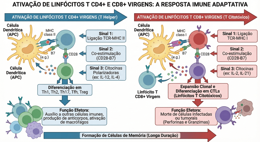 Quando a situação exige uma resposta mais específica e sofisticada, entra em cena a apresentação de antígenos. A célula dendrítica, após capturar fragmentos do ambiente, migra para os linfonodos e apresenta essas informações aos linfócitos, atuando como uma tradutora que conecta a imunidade inata à imunidade adaptativa. É nesse momento que a resposta se bifurca em duas estratégias complementares.