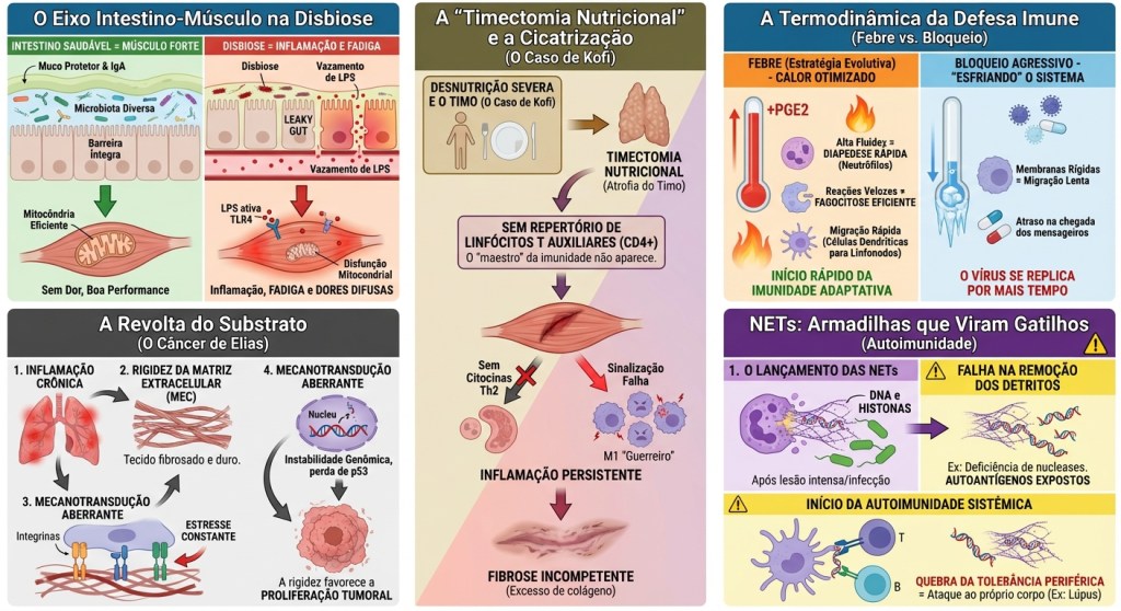Essa conversa molecular não fica restrita ao abdômen. Ela se espalha de forma fluida, como uma rede onde qualquer ponto conecta-se a qualquer outro. Aqui, a fisioterapia encontra seu fundamento molecular. O músculo esquelético, quando ativado pelo exercício, atua como um órgão endócrino, liberando miocinas como a Interleucina-6 (IL-6) de origem muscular, que tem um potente efeito anti-inflamatório, melhorando a sensibilidade à insulina e conversando com o tecido adiposo e o cérebro. O movimento físico modula a mecanotransdução, instruindo macrófagos a transitarem do perfil M1 (inflamatório, necessário para limpeza inicial) para o perfil M2 (reparador, essencial para a cicatrização).