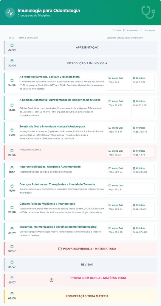 Nossa disciplina será ministrada de forma integrada. Não vamos estudar “célula T” no vácuo; vamos estudá-la decidindo se o osso alveolar vai ser destruído ou preservado. Para guiar essa jornada, usaremos dois textos que se complementam perfeitamente: